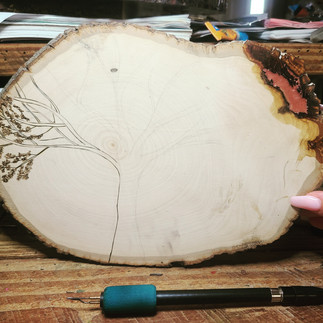 After I finished the burn, I wasn't really happy with it - it was a tree for sure, but didn't scream "cherry blossoms". I typically use watercolors or watercolor pencils but this one needed some depth and texture. The different shades of pink acrylic layered on top of the burn was exactly what it needed. It may look great but this piece is all about the texture that's hard to capture with a camera - you really need to run your hand over this one to get the full effect!